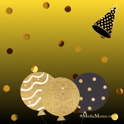 Bursting with elegance and sparkle, this festive scene features a trio of balloons in shimmering gold, white, and black—each with its own stylish design. A dotted party hat playfully pops into the corner, while golden confetti drifts down like a mini celebration frozen in motion. Set against a sleek gradient background from deep yellow to black, this animation brings a touch of glamour to any birthday greeting. Ideal for someone who loves bold, classy vibes and golden moments.