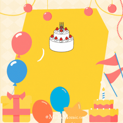 This playful animation brings a cheerful party scene to life. Right in the middle, a creamy birthday cake sits proudly, topped with bright strawberries and flickering candles that give off a warm, inviting glow. Colorful balloons float around joyfully, while streamers, gift boxes, and flags fill the space with festive energy. The bold yellow backdrop adds an extra dose of sunshine and happiness, making this a delightful way to spread birthday cheer and smiles all around.