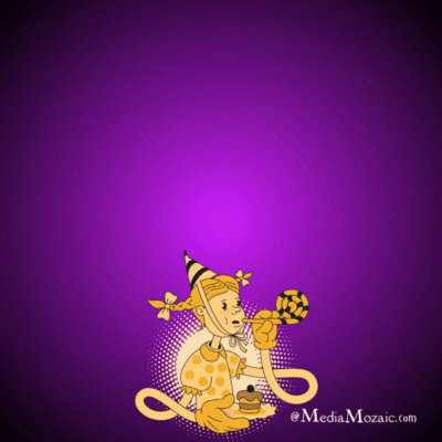 A playful happy birthday gif unfolds as a cartoon monkey dressed in a polka-dotted outfit and birthday hat sits center stage on a glowing purple background. With wide eyes and a cheeky smile, it blows a party horn, letting out bursts of festive energy. In one hand, it clutches a tiny cupcake topped with a single candle, ready for a bite. The gentle animation and quirky character make this perfect for lighthearted birthday messages, especially for those who love a little silliness and fun in their celebrations.