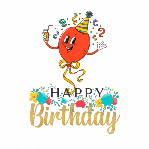 A cheerful balloon with a drink and party hat celebrates in this lively GIF. Glittery text and floral accents make it festive and fun.One of the top funny birthday GIFs for spreading birthday cheer.