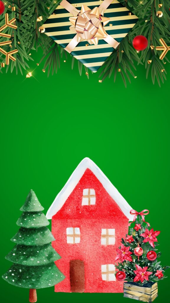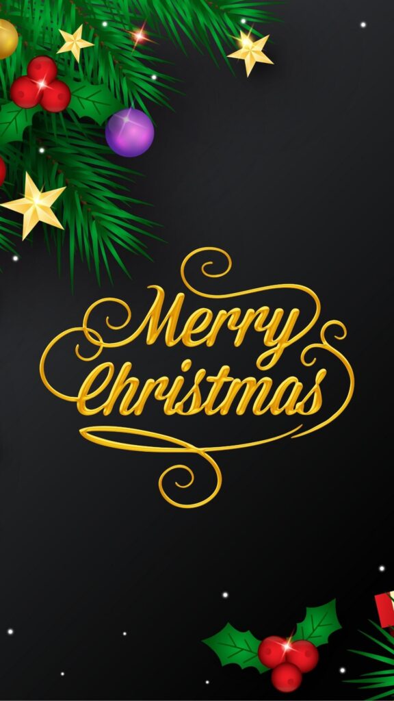 This stunning iPhone wallpaper features a bold black background with golden “Merry Christmas” script surrounded by festive pine branches, ornaments, and holly leaves. It’s the perfect mix of elegance and Christmas spirit.