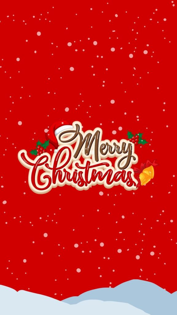 This vibrant red Christmas iPhone wallpaper features falling snow and a bold “Merry Christmas” greeting accented with holly leaves, golden bells, and a Santa hat. It’s full of holiday energy and cheer.