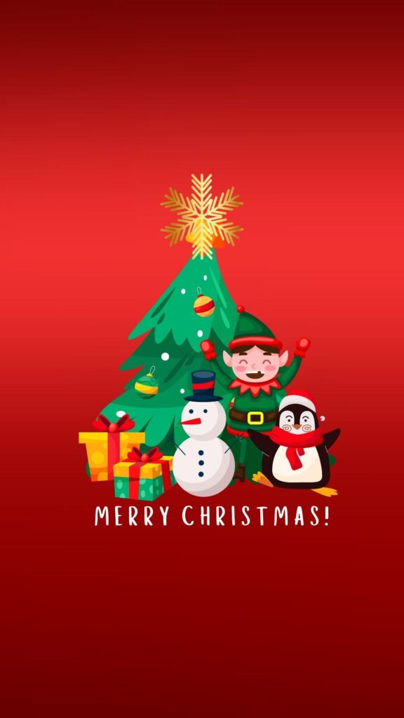 his adorable Christmas wallpaper for iPhone features a cheerful elf, a smiling penguin, and a happy snowman standing in front of a beautifully decorated Christmas tree. The vibrant red background and festive “Merry Christmas” text make it perfect for spreading holiday joy.