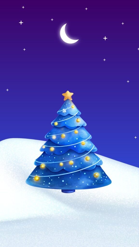 Celebrate a calm and peaceful Christmas with this iPhone wallpaper showing a glowing blue Christmas tree under a crescent moon and starry night sky. The snowy hills add to the serene, magical holiday vibe.