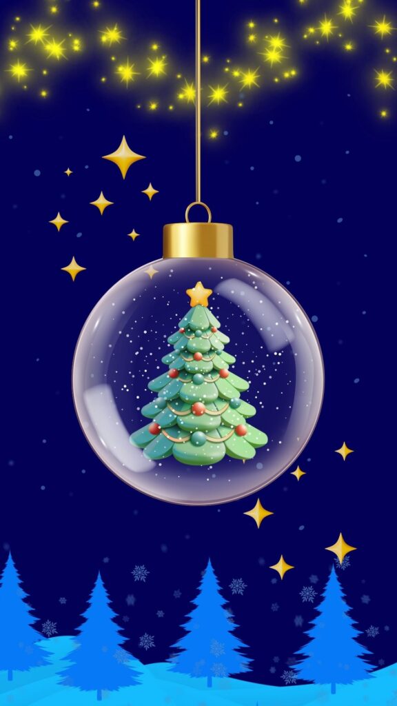Magical Christmas iPhone wallpaper showing a decorated tree inside a glass ornament, hanging against a starry blue sky — whimsical and enchanting.